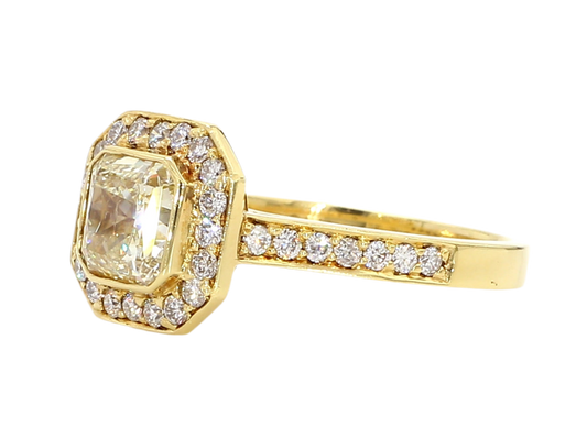 ENGAGEMENT RING, LIGHT YELLOW SQUARE CENTER, 1.37 CT, CUSHION HALO RING, 2.17 CARAT TOTAL WEIGHT, 18K YELLOW GOLD