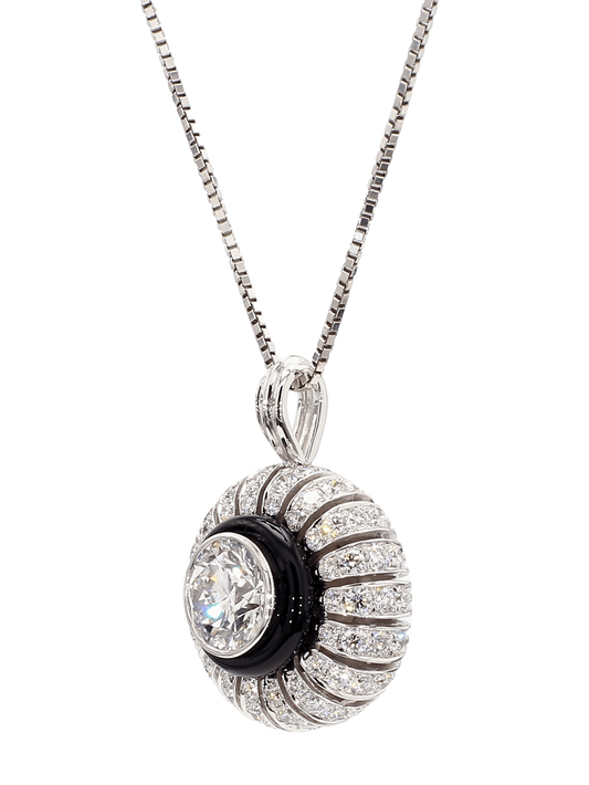 TORUS NECKLACE 2.53 CARAT TOTAL WEIGHT, TRIPLE EXCELLENT ROUND BRILLIANT, 1.26 E VVS1, GIA #2151110355, 1.27 MELEE, BLACK ONYX, 18K WHITE GOLD