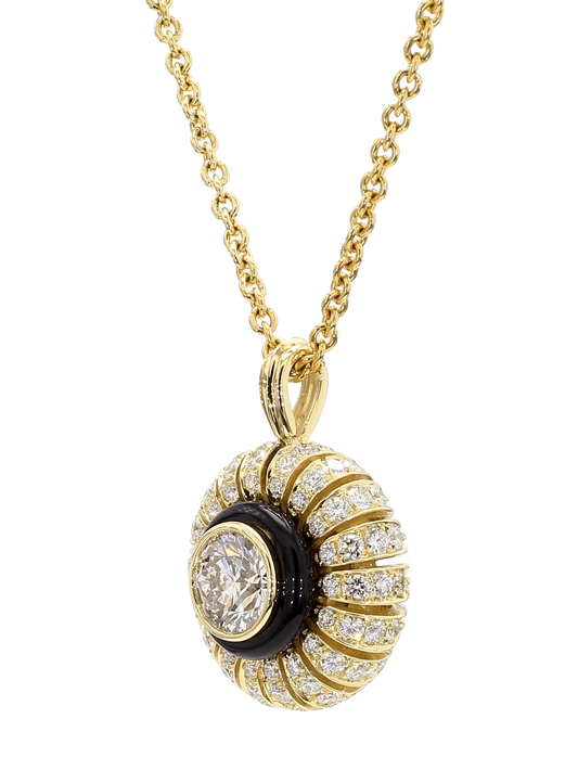 TORUS NECKLACE 2.29 CARAT TOTAL WEIGHT, TRIPLE EXCELLENT ROUND BRILLIANT 1.02 E VS1, GIA #7221403423, 1.27 MELEE, BLACK ONYX, 18K YELLOW GOLD